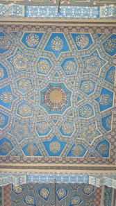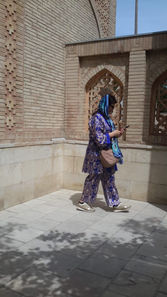 Le petit déjeuner est copieux et délicieux. Tant mieux, car nous partons à la découverte des environs de Boukhara. Il fait déjà très chaud à 9H, environ 20° et le soleil est déjà brûlant. Heureusement, nous avons un bus. Premier arrêt à l’ensemble commémoratif de Bahauddin Nakshband. Très fréquenté, plus de locaux que de touristes. Nous devons nous voiler afin de ne pas choquer. Un peu difficile avec cette chaleur... On y trouve plusieurs mosquées et un mausolée. Au centre, une cour ombragée avec un bassin. On y vient en famille pour prier. Aujourd’hui, vendredi, c’est jour de prière. L’endroit est particulièrement fréquenté.… C’est grandiose. Des plafonds ouvragés, des colonnes en bois sculptés, et toute une palette de bleu qui créent une atmosphère douce et sereine.